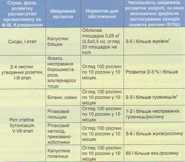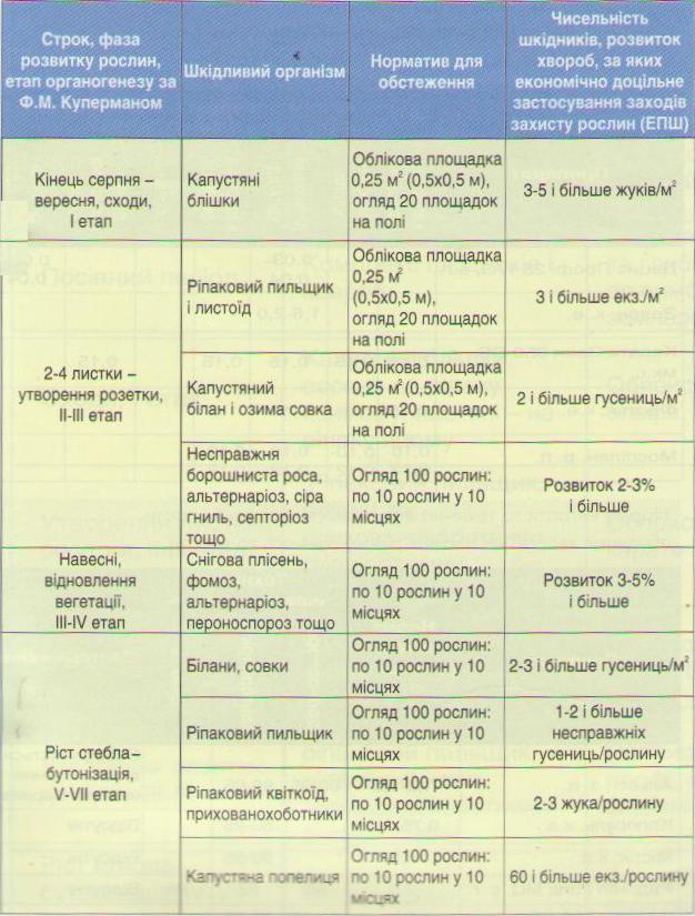 Для одержання максимальної ефективності від хімічних та біологічних засобів захисту посівів ріпаку озимого та ярого дуже важливо застосовувати їх за фітофенологічним принципом при чисельності шкідників і розповсюдженості хвороб вище ЕПШ (див. табл. 4 та 5).