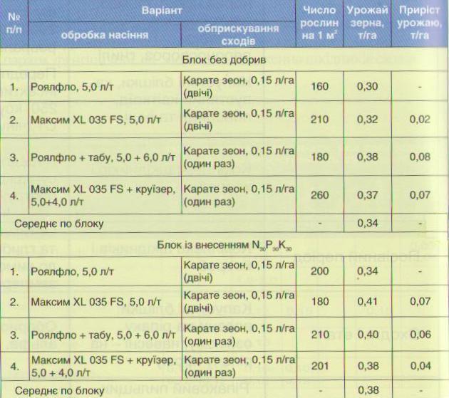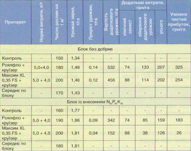 За нашими даними, на сорті ріпаку ярого Атаман після попередника озима пшениця, в середньому за 2006 і 2008 роки (див. табл. 10), у контролі (без застосування інсектицидів) зійшло і залишилось живими 150-160 рослин, у варіанті з обробкою насіння сумішкою роялфло з круїзером і сумішкою максима ХL 035 FS з круїзером залишились живими відповідно 180-190 рослин та 200 рослин на 1 м?. У середньому в блоці з добривами (N30Р30К30) урожайність зерна була на 0,51 т/га вищою, ніж у блоці без добрив. Обробка насіння сумішками фунгіцидних протруйників з круїзером збільшила урожайність зерна ріпаку ярого в блоці без добрив на 0,12-0,14 т/га, з добривами - на 0,04 -0,09 т/га. Застосування цих препаратів дозволило одержати в блоці без добрив 254-325 грн/га, з добривами - 26-183 грн/га умовно чистого прибутку.