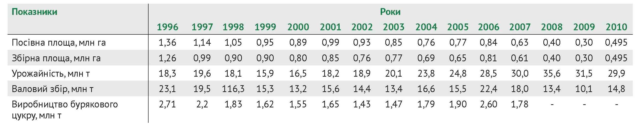 - Зміна форм господарювання і погіршення економічного стану бурякосіючих господарств негативно вплинуло на галузь буряківництва нашої держави, зменшились посівні площі під культурою та валові збори коренеплодів більш ніж утричі.