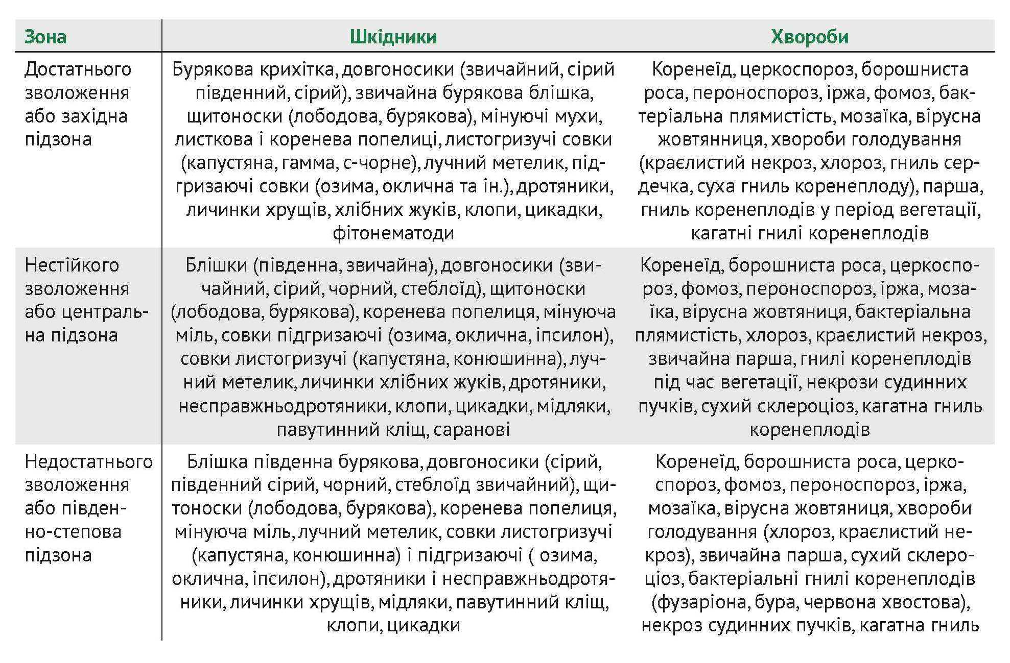 На території України цукрові буряки (фабричні, маточні і насінники) пошкоджують понад 200 видів фітофагів та уражуються близько 69 видами збудників хвороб (табл. 4).