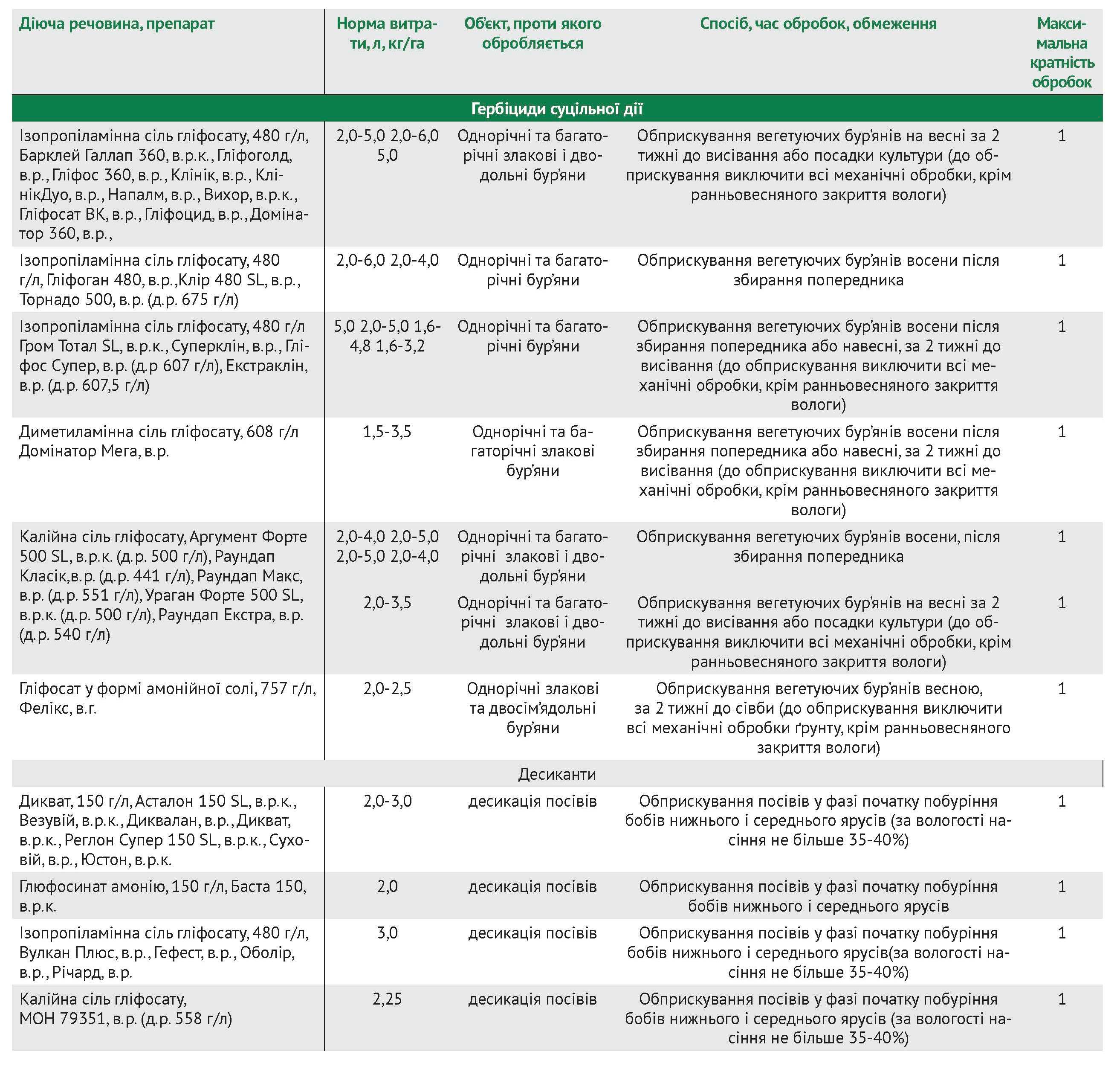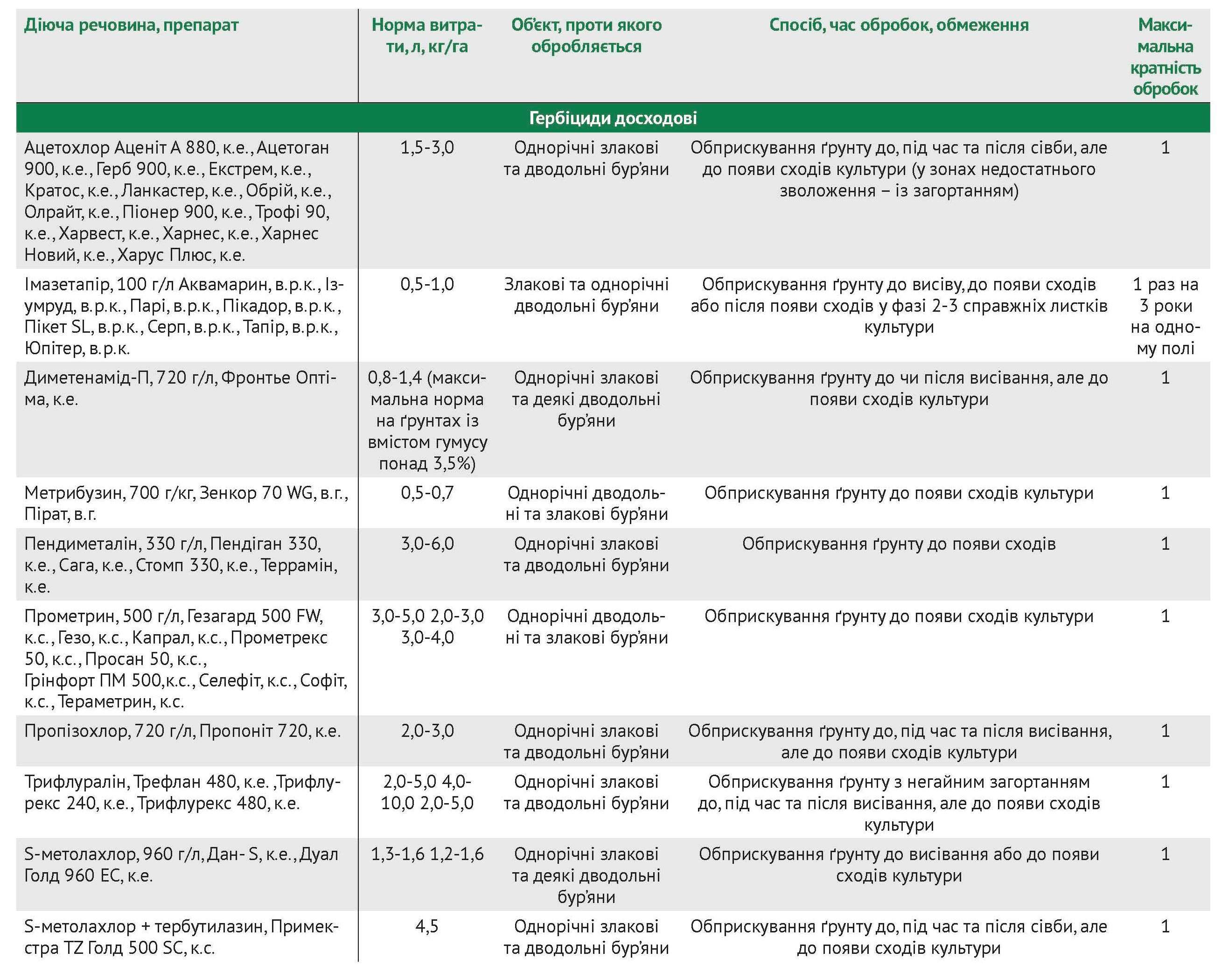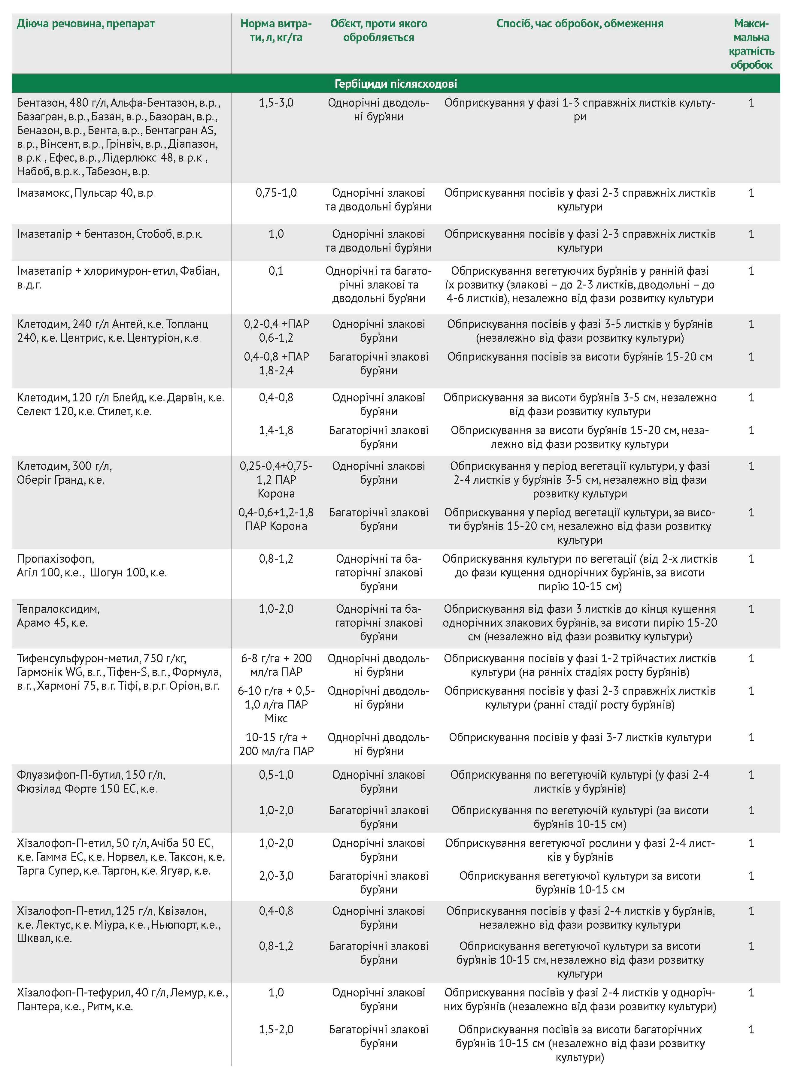 Для захисту посівів сої від бур’янів використовують як до-, так і післясходові гербіциди різних хімічних груп (див. таблицю).