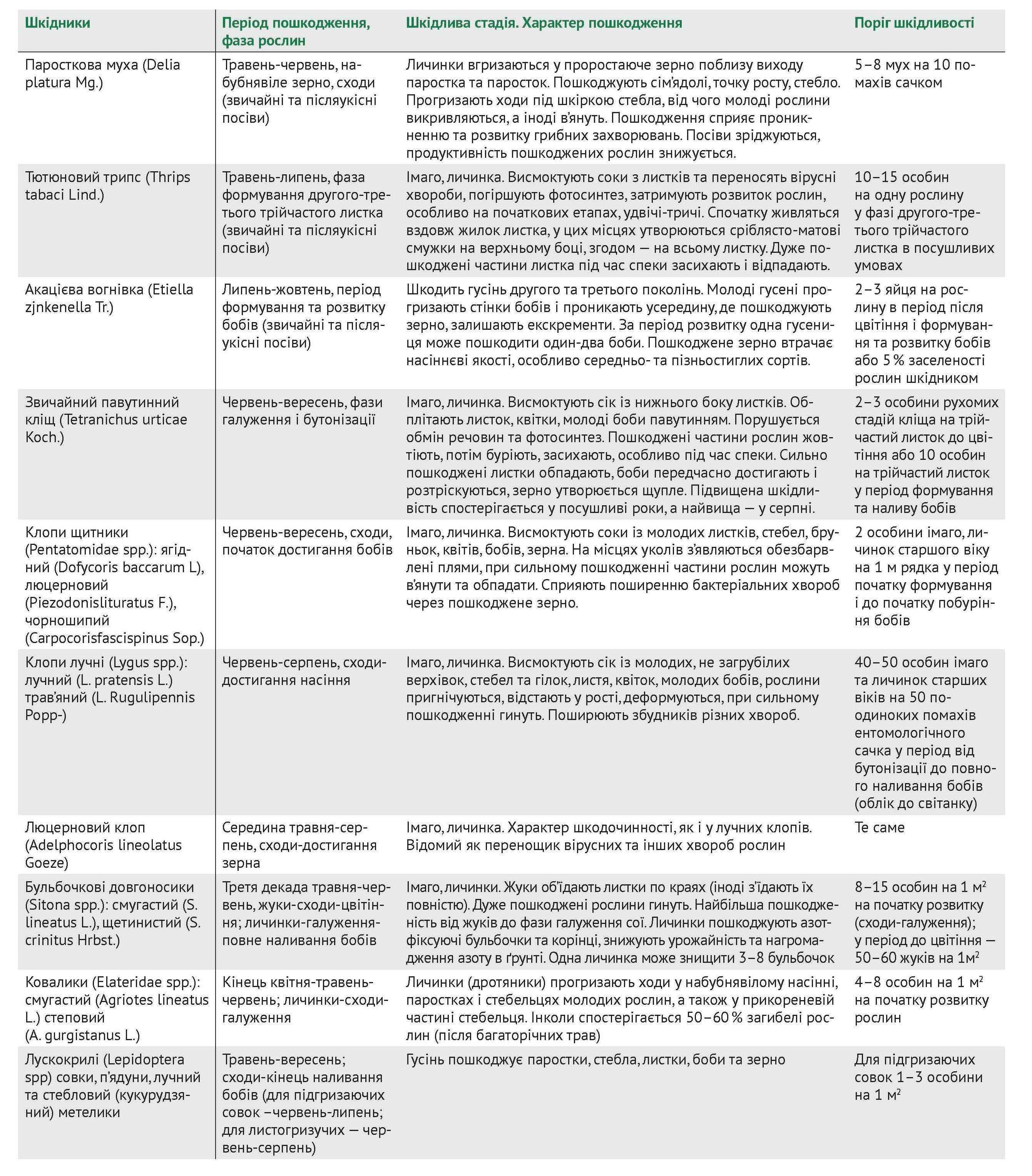 Слід відмітити, що обов’язковою умовою доцільності застосування пестицидів, тобто проведення захисних заходів проти шкідливих організмів є їх економічна порогова шкідливість з урахуванням фаз розвитку рослин сої, погодних умов, чисельності ентомофагів тощо.