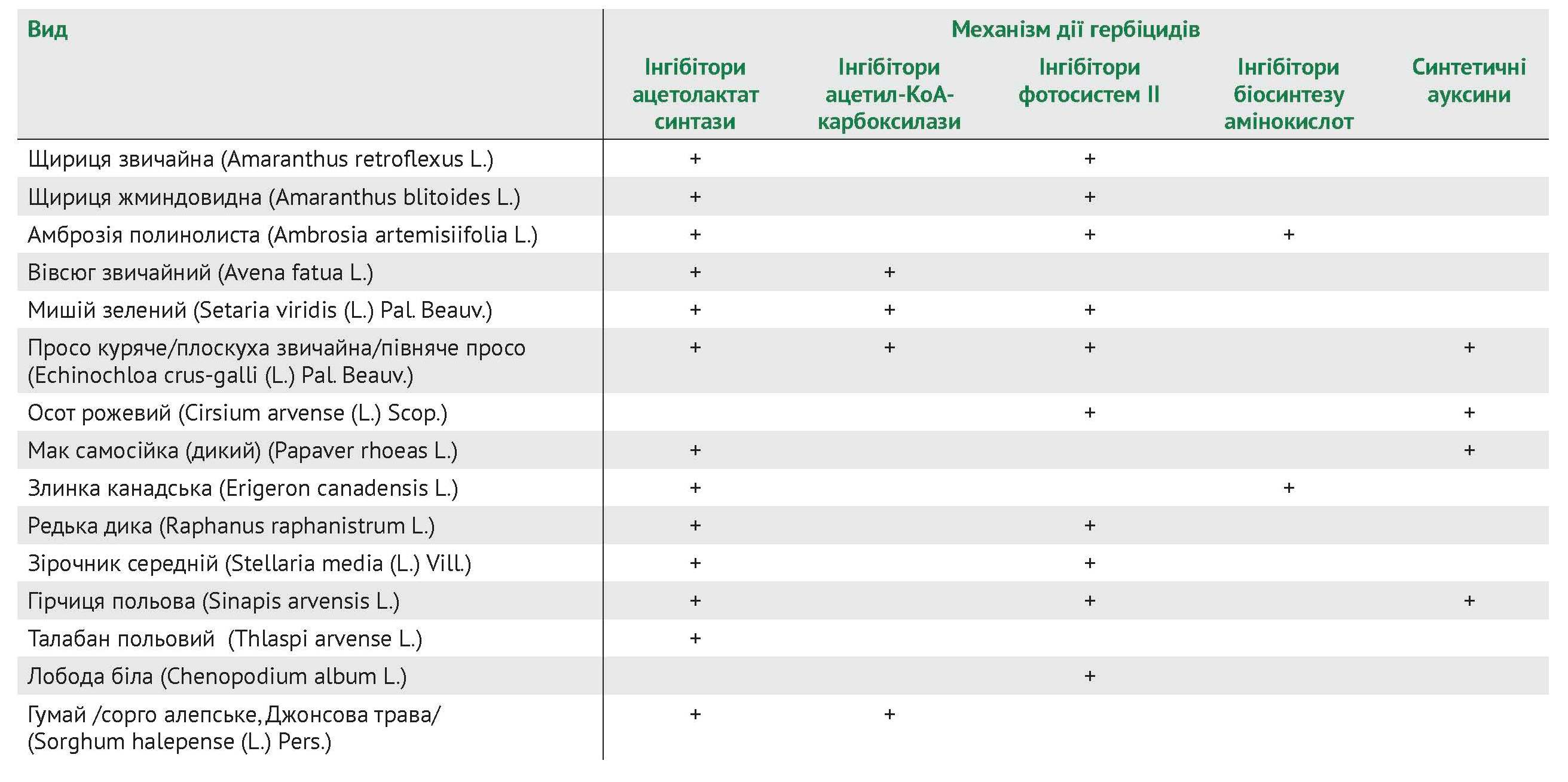 Частина видів бур’янів, що здатні до утворення резистентних біотипів, є і у складі сегетальної флори України. Враховуючи наявність такого чинника, потрібно постійно відстежувати явище стійкості до гербіцидів (табл. 2).