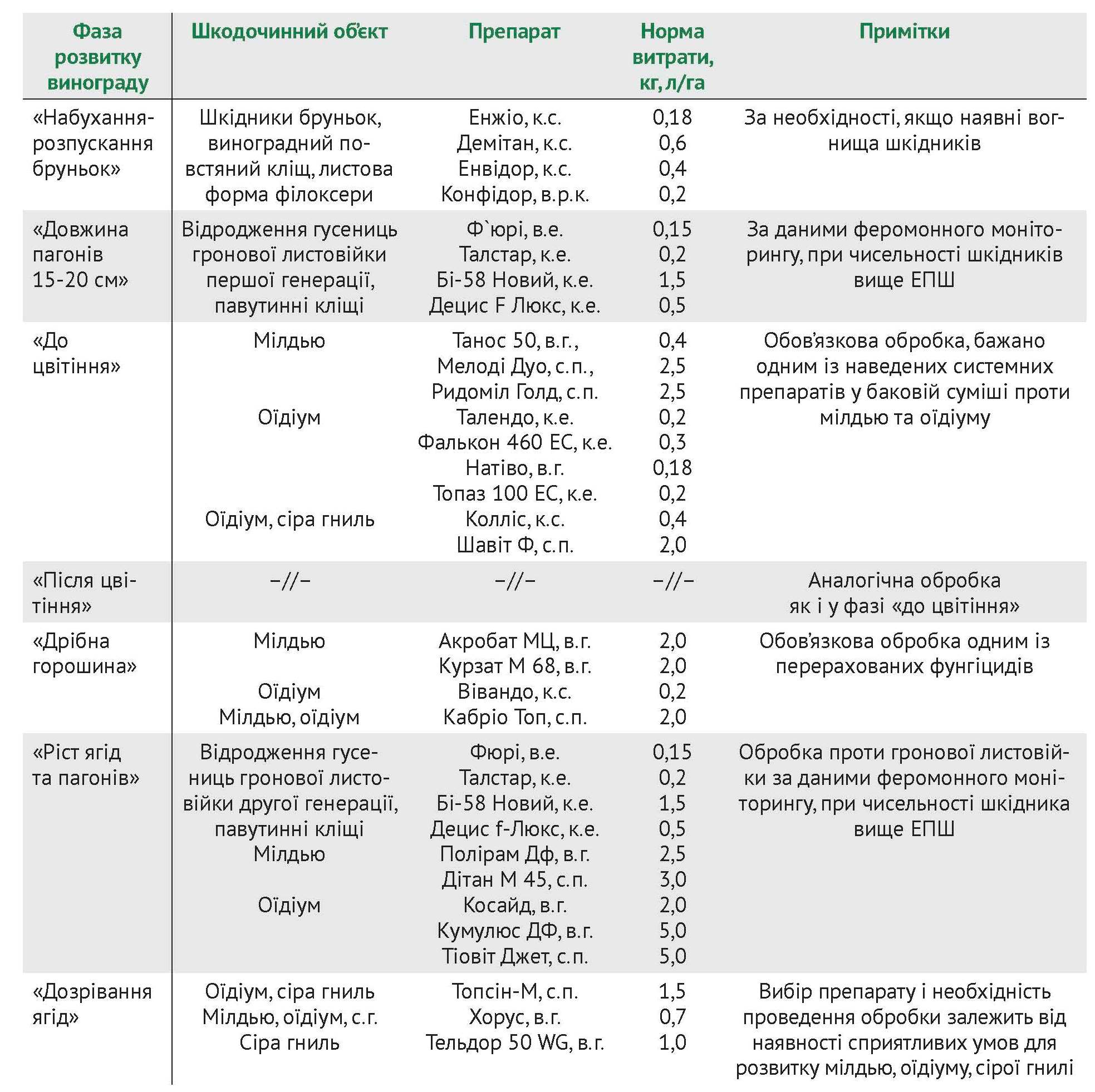 Обґрунтований захист винограду від основних хвороб – мілдью і оїдіуму – вимагає проведення фітосанітарного моніторингу та прогнозування їх розвитку в умовах поточного року. Проведення першого профілактичного обприскування фунгіцидами необхідно запланувати в термін «перед цвітінням» винограду (див. таблицю). У разі інтенсивного ураження оїдіумом виноградних рослин протягом попереднього вегетаційного періоду проведення першого обприскування на таких ділянках потрібно проводити в період «розпускання бруньок – утворення 2-3 листків» фунгіцидами системної дії (Топаз, Фалькон тощо), відмінну ефективність при ранньовесняних обприскуваннях показує препарат Імпакт. Наступні хімічні обробки винограду проводять залежно від погодних умов через 14 днів.