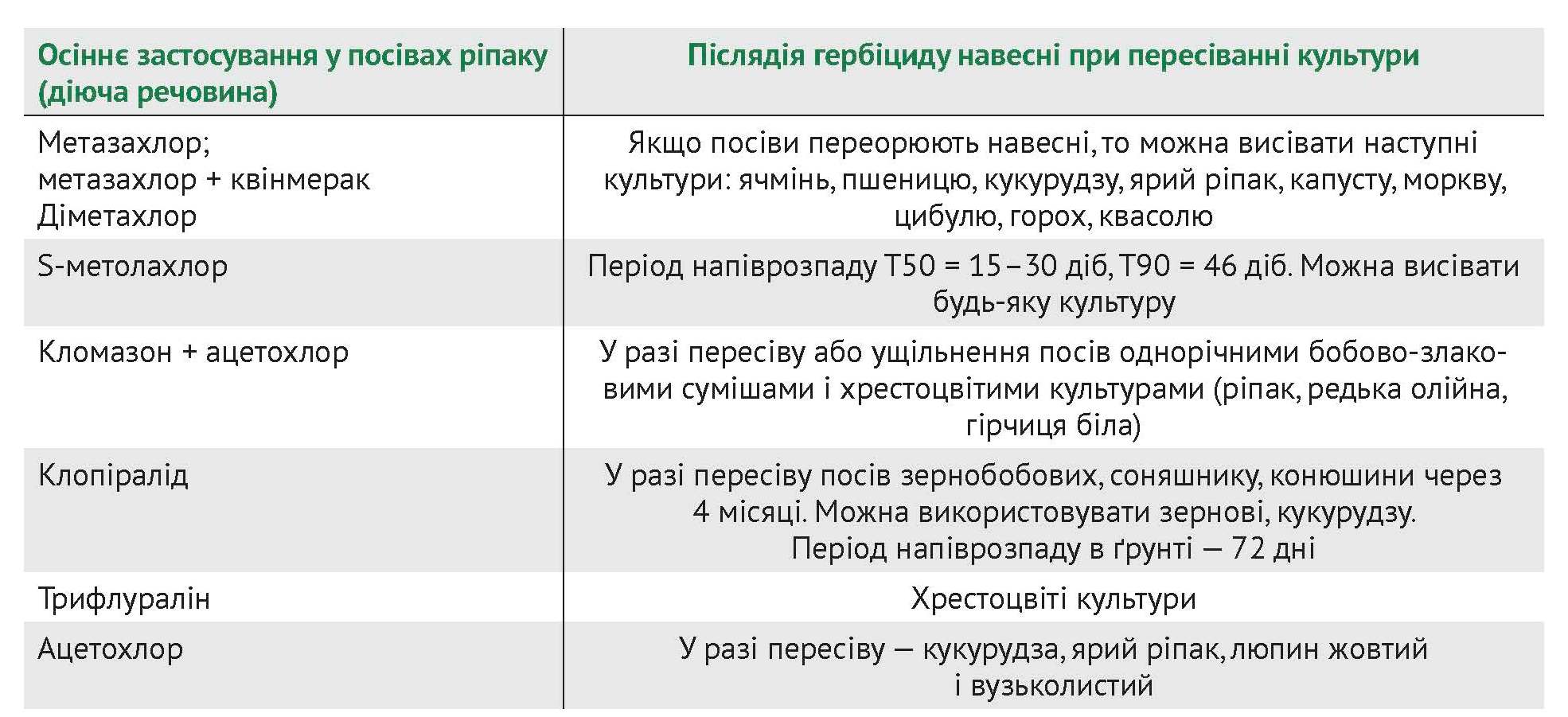 За умов поганої перезимівлі посівів ріпаку (вимерзання, зрідження тощо) при пересіві треба враховувати післядію препаратів, які застосовувалися за осіннього застосування (див. табл.).