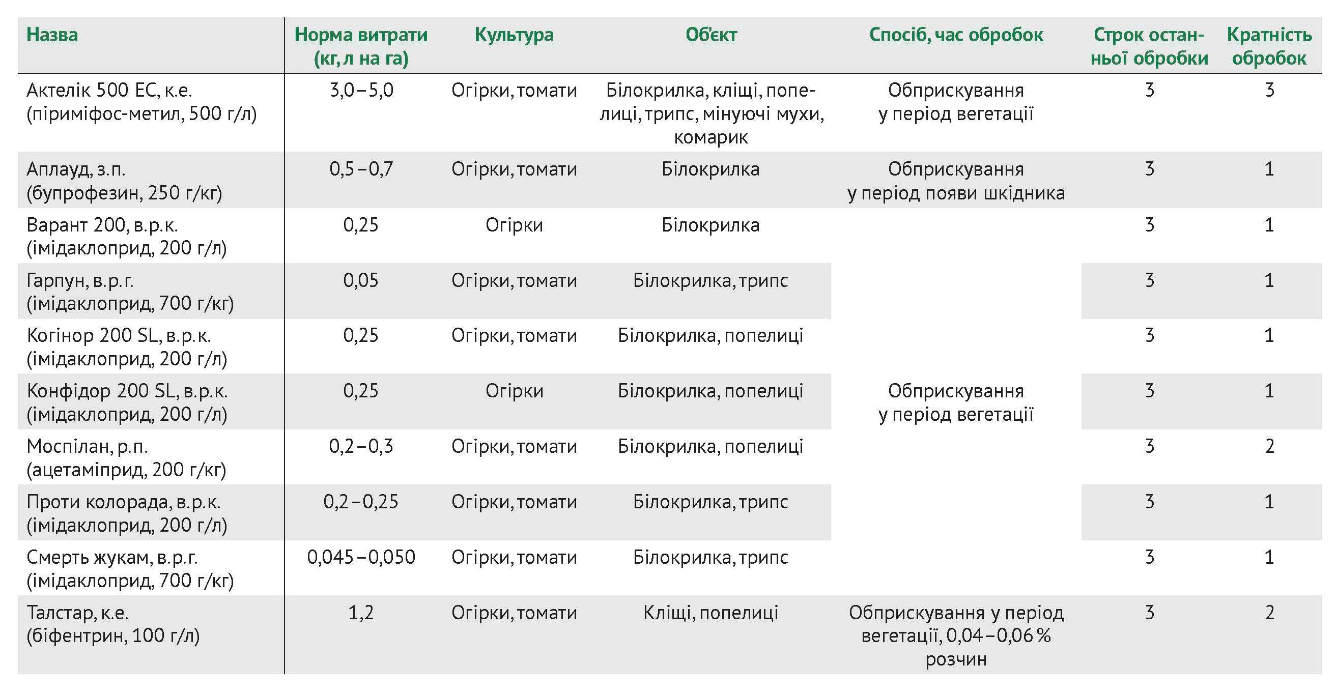 у період вегетації овочевих культур застосовують препарат біологічного походження Актофіт 0,2% к. е. (комплекс природних авермектинів) проти кліщів (4 мл/л), попелиць (8 мл/л), трипсів (10 мл/л). Кількість обробок протягом вегетації становить 1-2;