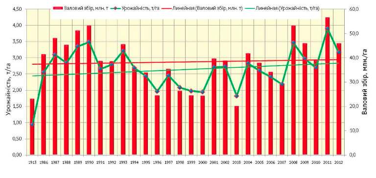 У 2011 році було несподівано побито рекорд 2008 року, коли валовий збір зернових культур по Україні становив 56,7 млн т за середньої урожайності 3,9 т/га. При цьому пшениця озима забезпечила на круг 3,35 т/га. Втім, торік через посушливі погодні умови протягом вегетаційного періоду у багатьох регіонах України різко знизилася урожайність озимих зернових культур. Порівняно високий валовий збір зернових (понад 46 млн т) у поточному році було одержано переважно за рахунок кукурудзи, при цьому середня урожайність зернових становила 3,16 т/га.