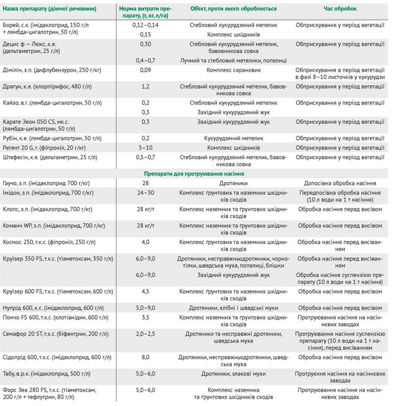 Якщо чисельність шкідників на посівах кукурудзи перевищує економічні пороги шкідливості, необхідні спеціальні захисні заходи, зокрема хімічні (див. табл.).