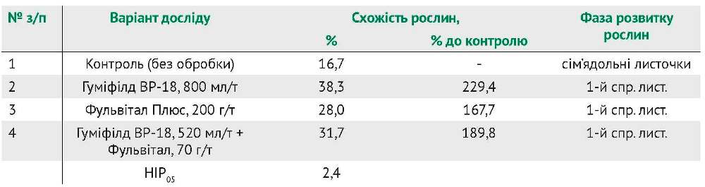 Згідно з даними табл. 1, найвища схожість рослин була у варіантах, де використовували препарати Гуміфілд ВР - 18, 800 мл/т та Фульвітал Плюс, 200 г/т. Схожих рослин у цих варіантах було на 52,1% та 40,9% більше порівняно з контролем.