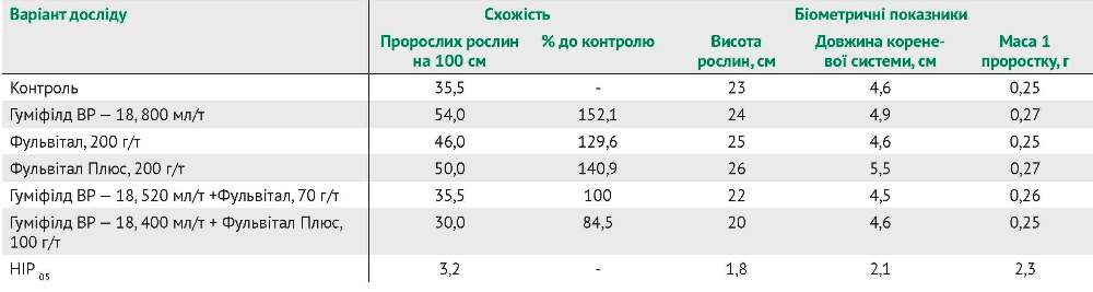 Як показали результати досліджень, в усіх дослідних варіантах схожість рослин та їх розвиток були кращими порівняно з контролем (табл. 2). Схожість рослин у дослідних варіантах була на 67,7–129,4% вищою порівняно з контролем. Навіть сумісне застосування Гуміфілду та Фульвіталу зі зменшеними нормами витрати забезпечило позитивний результат. Найвищою рістстимулюючою активністю характеризувався препарат Гуміфілд ВР-18 з нормою витрати 800 мл/т. У цьому варіанті були найбільші за висотою та розвитком листової поверхні рослини.