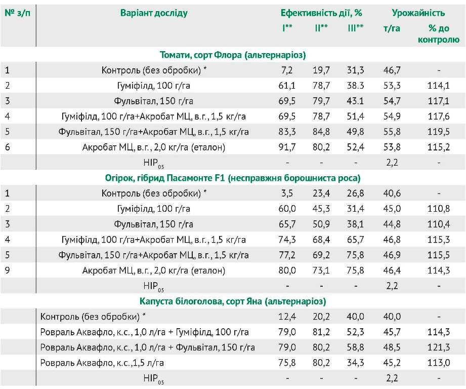 На капусті білоголовій ефективність Гуміфілду та Фульвіталу проти сухої плямистості досліджували при сумісному застосуванні з фунгіцидом Ровраль Аквафло, к. с. За низького рівня розвитку хвороби ефективність препаратів в усіх варіантах досліду була на однаковому рівні, а за високого розвитку хвороби (40,0%) ефективність сумішей препаратів була значно вищою за ефективність фунгіциду з повною нормою витрати. Найбільший урожай капусти забезпечило сумісне застосування фунгіциду Ровраль Аквафло, к. с., 1,0 л/га з Фульвіталом, 150 г/га - 48,5 т/га, що на 21,3% більше, ніж в контролі і на 8,3% більше, ніж при застосуванні цього фунгіциду з повною нормою витрати (1,5л/га).