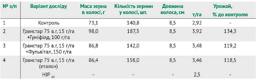 Аналіз біометричних показників та урожаю після збору культури показав, що такі показники, як маса зерна і його наповненість, кількість зерен в колосі та урожай, були набагато вищими у варіанті Гуміфілд+ Гранстар 75 в. г. Урожай зерна був на 34,3% вищим, ніж в контролі і на 15,8% більшим, ніж при застосуванні одного гербіциду.
