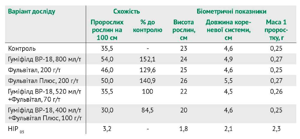 Як показали результати досліджень, в усіх дослідних варіантах схожість рослин та їх розвиток були кращими порівняно з контролем (табл. 2). Схожість рослин у дослідних варіантах була на 67,7–129,4% вищою порівняно з контролем. Навіть сумісне застосування Гуміфілду та Фульвіталу зі зменшеними нормами витрати забезпечило позитивний результат. Найвищою рістстимулюючою активністю характеризувався препарат Гуміфілд ВР-18 з нормою витрати 800 мл/т. У цьому варіанті були найбільші за висотою та розвитком листової поверхні рослини.