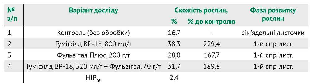 Згідно з даними таблиці 1, найвища схожість рослин була у варіантах, де використовували препарати Гуміфілд ВР - 18, 800 мл/т та Фульвітал Плюс, 200 г/т. Схожих рослин у цих варіантах було на 52,1% та 40,9% більше порівняно з контролем.