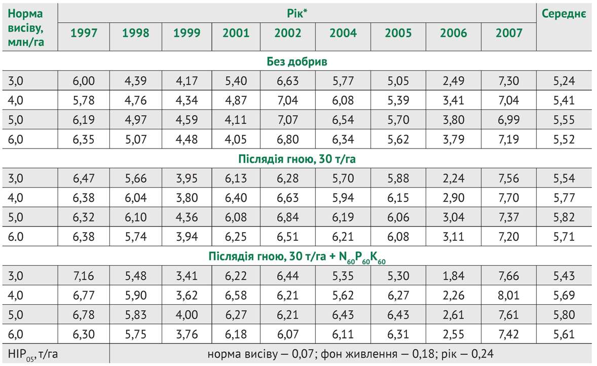 Отже, для одержання високої та стабільної за роками врожайності зерна пшениці озимої після попередника чорний пар її доцільно висівати з нормою 5,0 млн/га на усіх фонах живлення. За дефіциту насіння норму висіву можна зменшувати до 3,0 млн/га, але при цьому втрати врожайності будуть становити близько 7%. Після попередника горох на зерно норму висіву необхідно корегувати з урахуванням фону живлення. Так, на неудобреному фоні норма висіву має становити 6,0 млн/га, на фоні післядії гною - 5,0 млн/га, а на інтенсивному фоні удобрення норму висіву доцільно зменшувати до 4,0 млн/га.