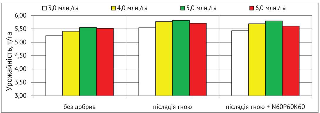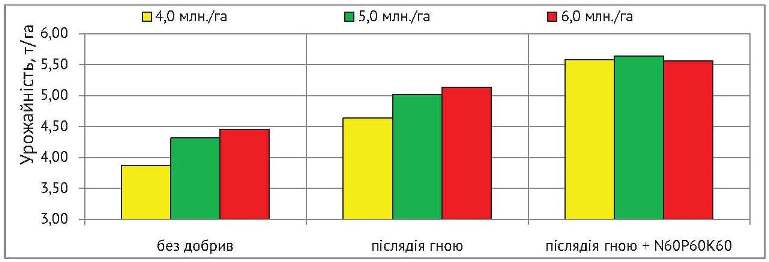 Істотне зниження урожайності пшениці озимої після чорного пару відбувалося за найменшої норми висіву - 3,0 млн/га. Так, різниця урожайності між максимальним (5,0 млн/га) та мінімальним (3,0 млн/га) рівнем урожайності на фоні без добрив становила в середньому 0,31 т/га (5,8%), на фоні післядії гною - 0,28 т/га (5,0%), а на фоні післядії гною + N60P60K60–0,37 т/га (6,8%) (табл. 2, рис. 1).