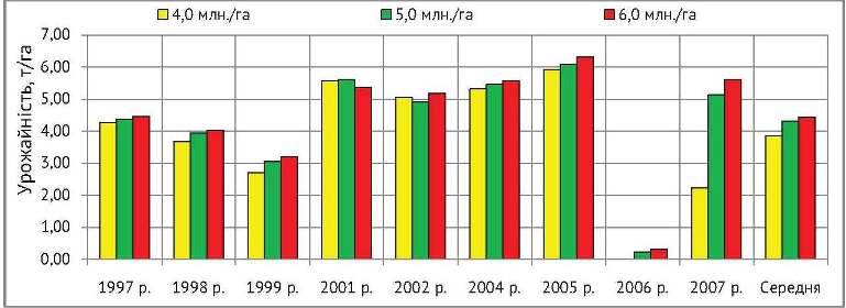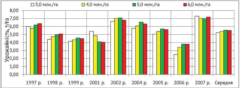 У восьми роках (1997 р., 1998 р., 1999 р., 2002 р., 2004 р., 2005 р., 2006 р., 2007 р.) з дев’яти досліджуваних після попередника горох на зерно найвищу врожайність пшениця озима формувала за норми висіву 6,0 млн/га і лише в один рік (2001) - за норми висіву 5,0 млн/га (див. табл. 2, рис. 4).