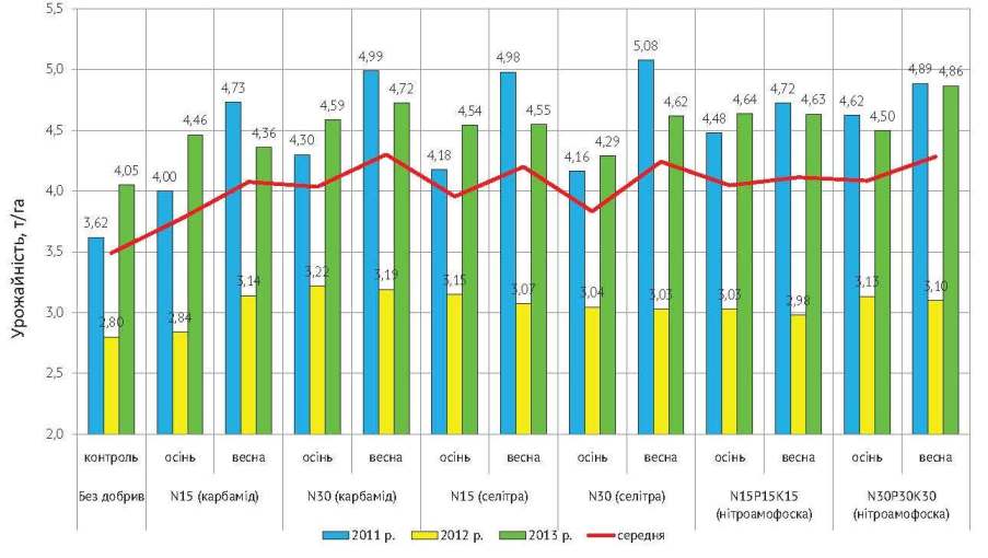 Так, у 2011 р. в умовах доброго зволоження застосування усіх варіантів підживлень сприяло одержанню достовірних прибавок врожайності порівняно з контролем (без підживлення). При цьому за осіннього підживлення (проводилося восени 2010 р.) найбільші прибавки врожайності одержано у варіантах з внесенням нітроамофоски в дозах N30P30K30 та N15P15K15, а також карбаміду в дозі N30, які становили відповідно 1,00 т/га, 0,86 т/га та 0,68 т/га, при цьому врожайність на контролі становила 3,62 т/га. За весняного підживлення найбільші прибавки одержано за внесення аміачної селітри в дозах N30 та N15 - відповідно1,46 т/га та 1,36 т/га, а також за внесення карбаміду в дозі N30–1,37 т/га. За усіх варіантів дози внесення добрив застосування осіннього підживлення поступалося весняному, що пояснюється коротким періодом (11 діб) від внесення добрив до припинення осінньої вегетації, в результаті чого рослини не змогли повною мірою поглинути внесенні елементи живлення. Максимальна різниця урожайності (0,80–0,91 т/га) між весняним та осіннім підживленням була за внесення аміачної селітри, а мінімальна (0,25–0,26 т/га) - за внесення комплексного добрива - нітроамофоски (табл. 1, рис. 1).