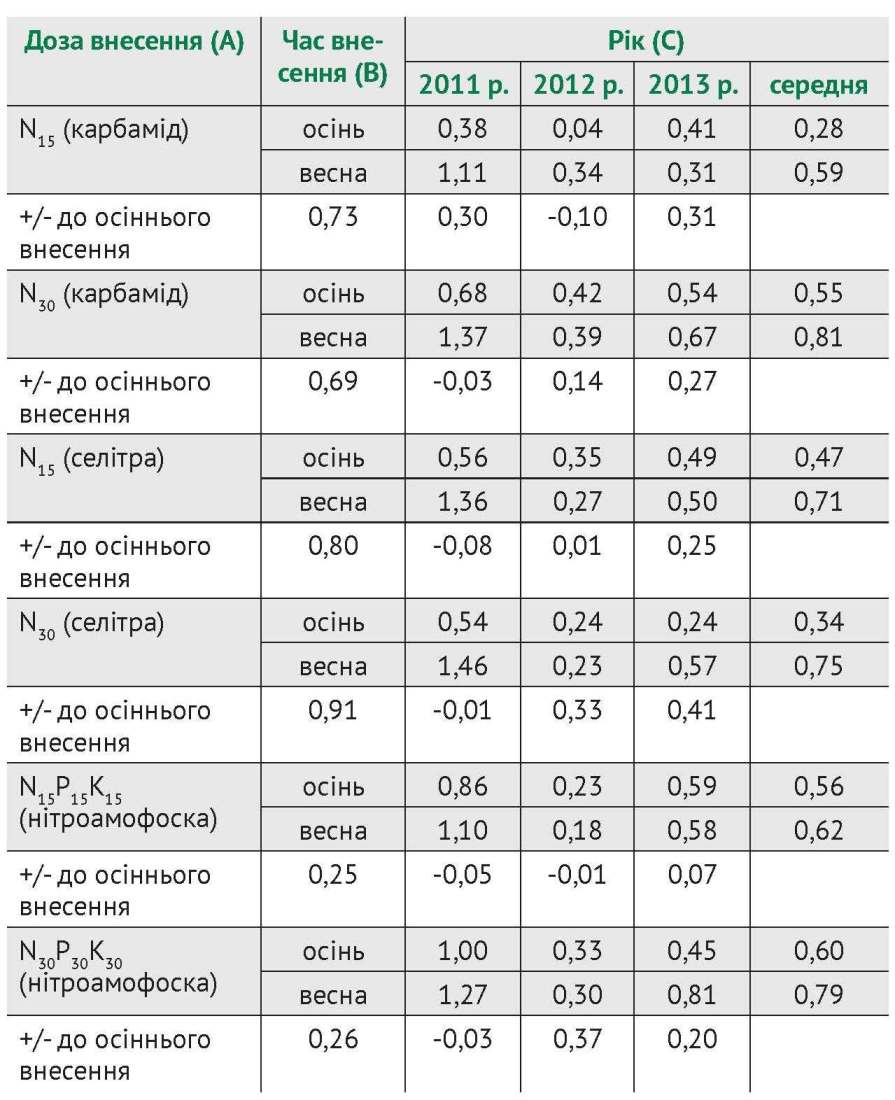 У 2011/2012 рр. за осіннього внесення азоту в дозі N15 вищу врожайність одержано від застосування аміачної селітри - на 0,31 т/га порівняно з внесенням карбаміду. За весняного внесення N15 різниця в урожайності пшениці озимої залежно від застосування аміачної селітри та карбаміду була неістотною. Доза азоту N30 в осіннє внесення сприяла збільшенню врожайності на 0,18 т/га за внесення карбаміду порівняно з аміачною селітрою. За весняного внесення N30 відмічали подібну тенденцію, але достовірної різниці врожайності виявлено не було.