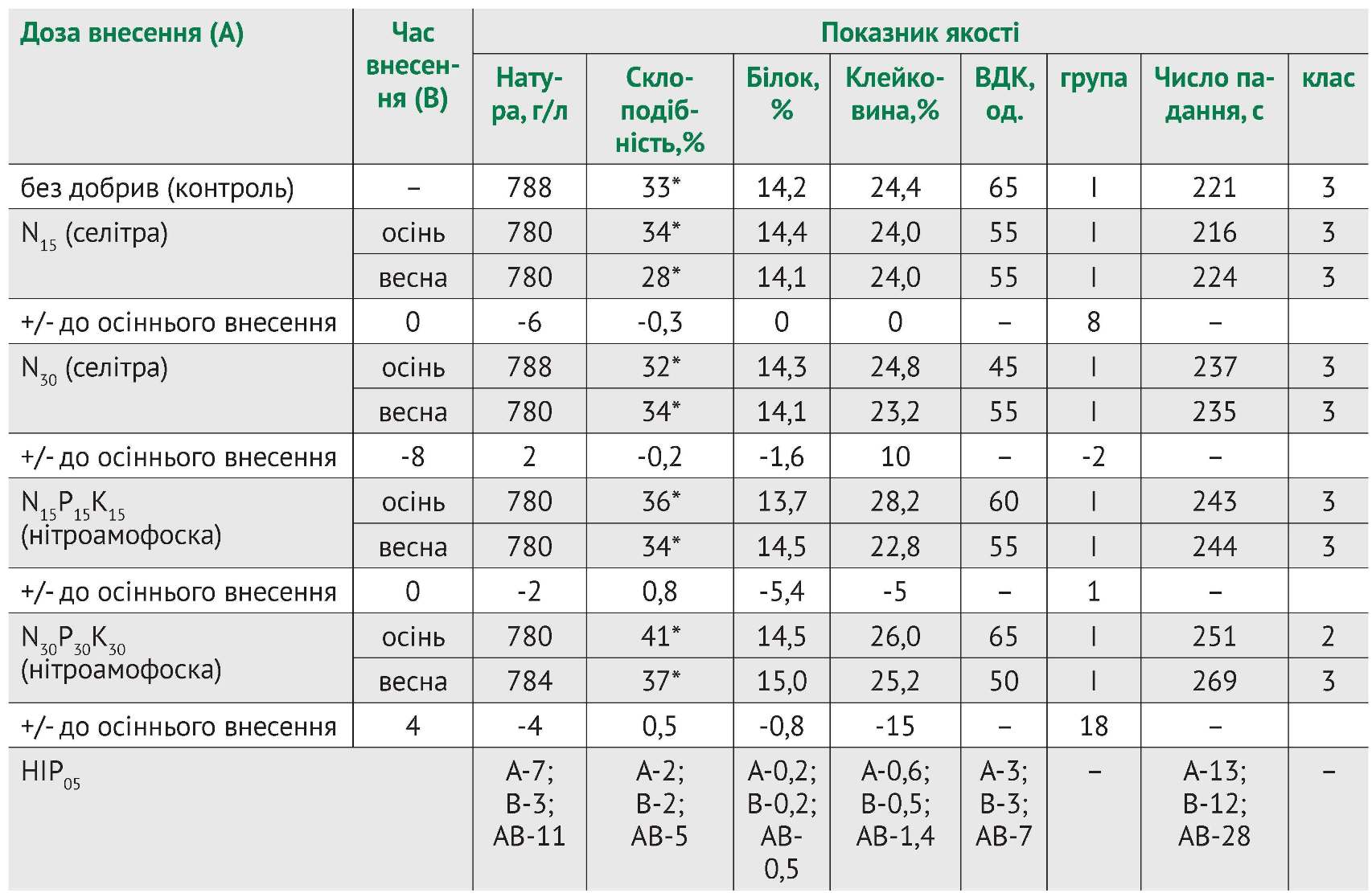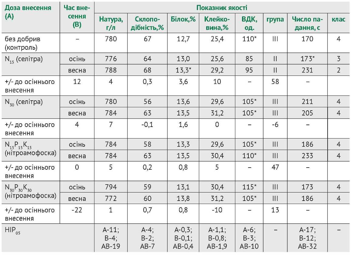 У 2011 р. найкращі показники якості зерна було одержано від застосування аміачної селітри в дозі N15. Так, за осіннього підживлення N15 натура зерна становила 776 г/л, склоподібність - 64%, вміст білка - 13,0%, клейковини - 25,6%, ВДК - 85 од., число падання - 173 с, що відповідало вимогам 3 класу згідно з ДСТУ 3768:2010, при цьому показник числа падання був класообмежуючим фактором. За весняного внесення N15 натура зерна становила 788 г/л, склоподібність - 68%, вміст білка - 13,3%, клейковини - 29,2%, ВДК - 95 од., число падання - 231 с, що відповідало вимогам 2 класу, при цьому вміст білка був класообмежуючим показником. За решти варіантів підживлення показники якості зерна відповідали вимогам 4 класу, класообмежуючим показником в усіх випадках було число падання (табл. 2).
