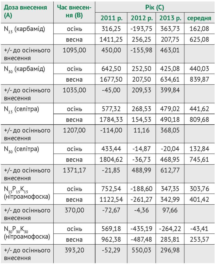 У 2013 р. застосування усіх варіантів підживлення (крім осіннього внесення N30P30K30) було прибутковим. Найвищі показники одержано за внесення осіннього та весняного внесення карбаміду в дозі N30 - відповідно 425,08 грн/га та 634,61 грн/га, селітри в дозі N15–479,02 грн/га та 490,18 грн/га та весняного внесення селітри в дозі N30–468,95 грн/га. У цьому році осіннє підживлення було більш ефективним порівняно з весняним (на 155,98 грн/га) лише за варіанту внесення карбаміду в дозі N15, за решти варіантів більш ефективним було проведення весняного підживлення.