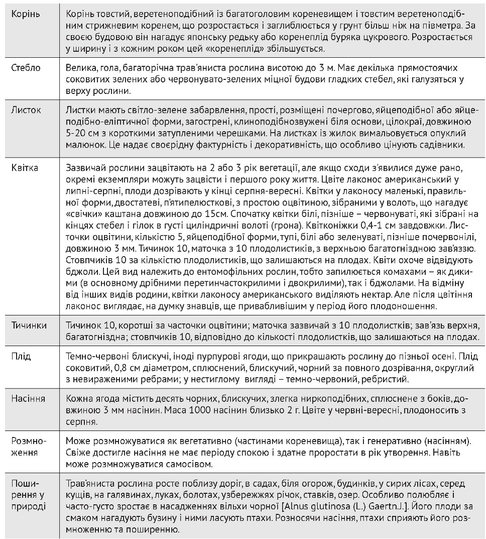 Таблиця 1. Ботанічна характеристика лаконосу американського (фітолакка американська)
