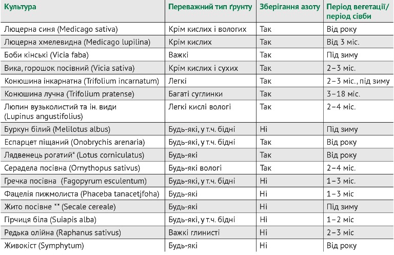 Таблиця 1. Відомості про рослини для вирощування на сидерат та їх особливості