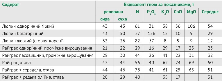 Таблиця 2. Агрохімічна характеристика рослин, вирощених на сидерат, порівняно з перегноєм, здійснена розрахунково-еквівалентним способом