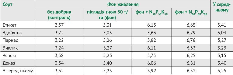 Сорти Доказ та Парнас виявилися найбільш інтенсивними, які забезпечили прибавку урожайності на фоні з внесенням мінеральних добрив у дозі N60P60K60, порівняно з дозою N30P30K30, на рівні 0,75 та 0,96 т/га відповідно. Сорти Здобуток і Аспект найменше реагували на удобрення.