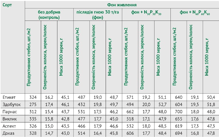 Також було встановлено, що на рівень урожайності переважно впливала кількість продуктивних стебел у посівах. Так, наприклад, на контрольному фоні цей показник становив у сортів Етикет і Парнас 324 і 312 шт./м2 відповідно, а на фоні післядії 30 т/га гною з основним внесенням N60P60K60 він був на рівні 640 і 700 шт./м2 відповідно (табл. 3). Інші показники структури урожайності (озерненість колоса, маса 1000 зерен) менше змінювалися залежно від фону живлення. Хоча слід відмітити, що у високорослих сортів (Етикет та Здобуток) вони значно позначалися на рівень урожайності. Так, на фоні післядії 30 т/га гною + N60P60K60 озерненість колоса у сортів Етикет і Здобуток сягала 19,1 і 19,5 зерен/колос відповідно, а маса 1000 зерен - 50,4 і 51,8 г відповідно, тоді як в інших сортів озерненість колоса не перевищувала 18,0 зерен/колос, а маса 1000 зерен - не більше 48,0 г.