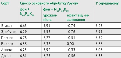 Тому можна стверджувати, що сорти Парнас та Доказ добре реагують на добрива, при цьому забезпечуючи високі прибавки урожайності. Сорти Етикет та Виклик, в умовах східної частини Лісостепу України, давали високі прибавки урожайності, лише при внесенні мінеральних добрив у дозі N30P30K30. У сортів Здобуток та Аспект, хоча і відмічали значні прибавки урожайності при внесенні добрив, але вони були менш значними, ніж в інших сортів. Отже, було встановлено, що із досліджуваних сортів сорти Парнас та Доказ є найбільш інтенсивні, а сорти Здобуток та Аспект - найменш інтенсивні.
