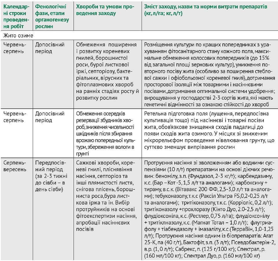 Знищення бур’янів та шкідників, резерваторів і переносників грибної, бактеріальної, мікоплазмової та вірусної інфекцій. Особливу увагу треба приділяти знищенню бур’янів і шкідників до цвітіння рослин жита на узбіччях полів, лісосмуг, узліссях.