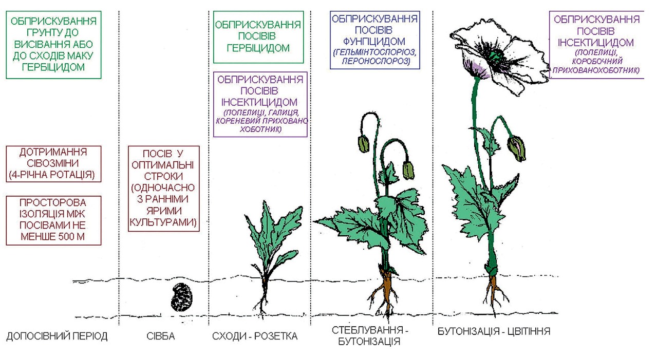 На основі проведених досліджень науковцями ІЗР НААН розроблена система захисту посівів маку олійного від шкідливих організмів (рис. 1). В її основу покладено принцип регулювання чисельності шкідників, бур’янів і розвитку хвороб у період формування основних елементів продуктивності рослин. Окремі прийоми агротехніки запозичені з літературних джерел.