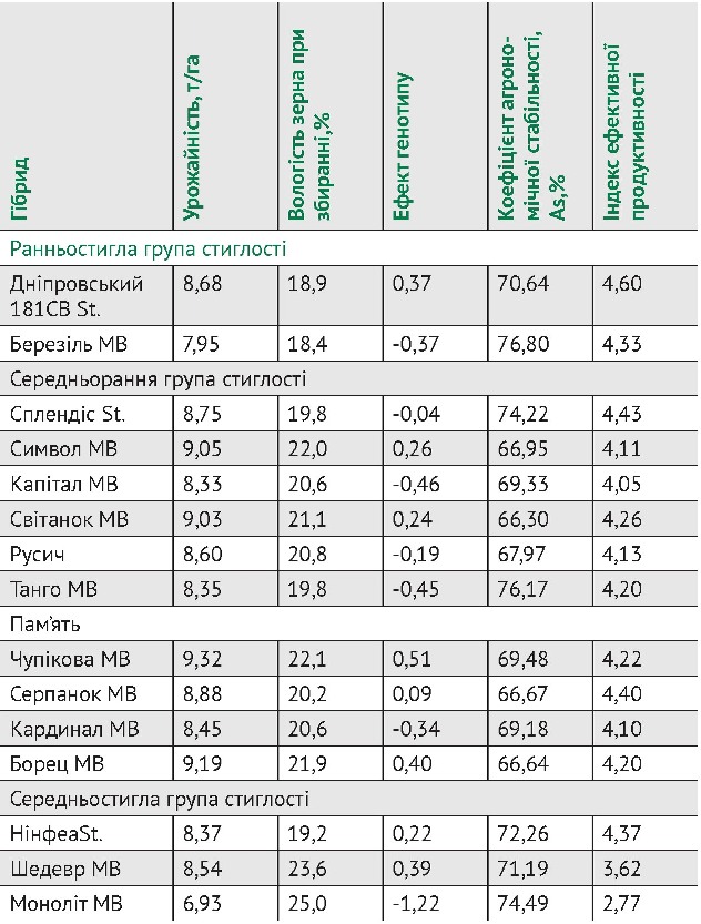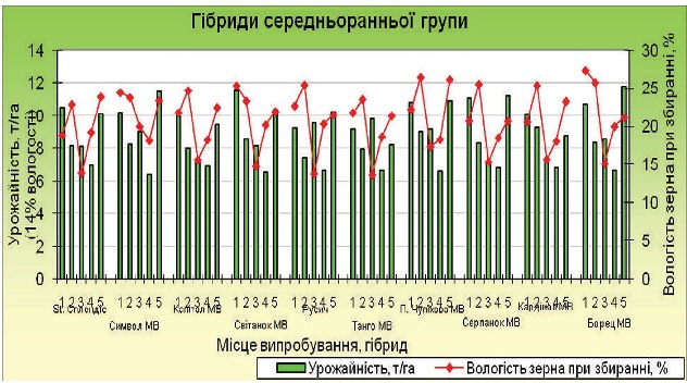 У середньому по пунктах випробування гібридів середньоранньої групи перевищення рівня урожайності над стандартом Сплендіс (середній рівень урожайності 8,75 т/га) мали гібриди: Символ МВ (0,30 т/га), Світанок МВ (0,28 т/га), Пам'ять Чупікова (0,55 т/га), Серпанок МВ (0,13 т/га) та Борец МВ (0,44 т/га). Середній рівень вологості зерна перед збиранням у стандарту Сплендіс становив 19,8 %, а у вище перерахованих гібридів від 20,2 до 22,1 %.
