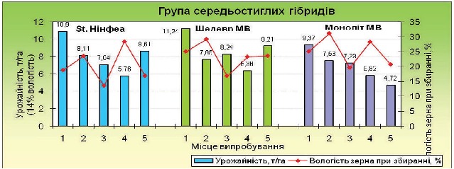 В середньому по пунктах випробування гібридів середньостиглої групи перевищення рівня урожайності над стандартом Нінфеа (середній рівень врожайності 8,09 т/га) мав гібрид Шедевр МВ - 0,45 т/га при вологості зерна 23,6 %. Середній рівень вологості зерна перед збиранням у стандарту Нінфеа становив 20,2 %.
