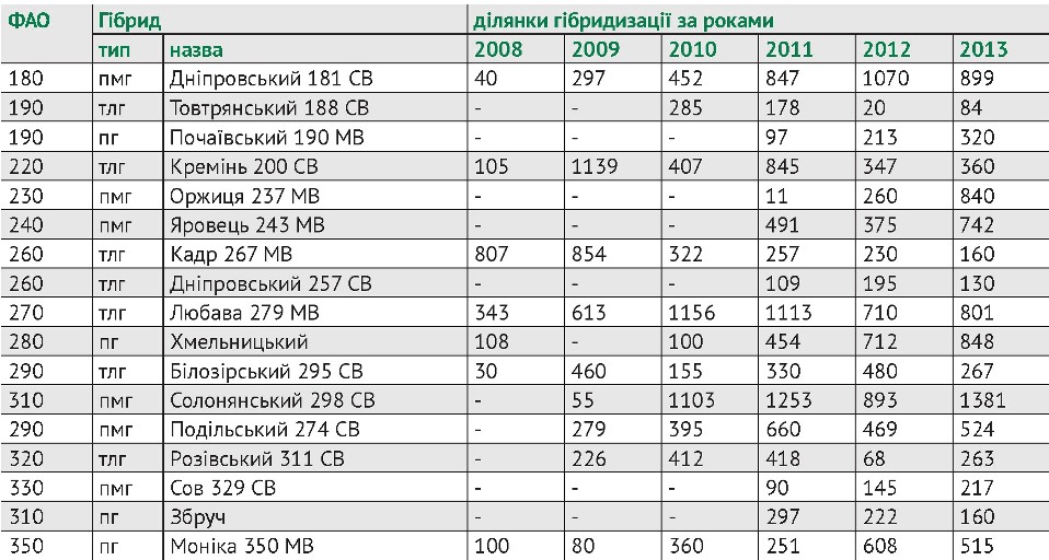 Таблиця 8. Обсяги насінництва деяких гібридів кукурудзи селекції ДУ ІСГСЗ НААН, га