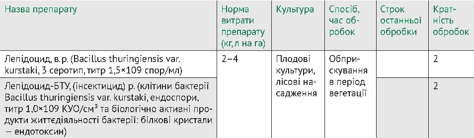Таблиця. Біопрепарати для захисту плодових культур та лісових насаджень від американського білого метелика