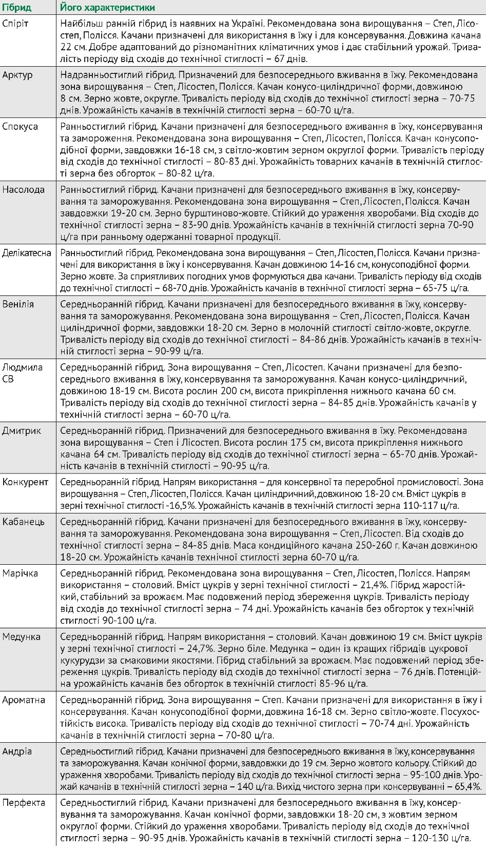 До Державного реєстру сортів рослин, придатних для поширення в Україні, занесені такі гібриди цукрової кукурудзи: Вега, Ароматна, Андріївський, Андріа, Арктур, Бостон, Болд, Венілія, Делікатесна, Джубілі, Дмитрик, Добриня, Кокані, Кабанець СВ, Конкурент, Леженд, Легасі, Людмила СВ, Медунка, Меркур, Мадонна, Марічка, Марта, Насолода, Оверленд, Перфекта, Роялті, Растлер, Рандеву, Сігнет, Снігова королева, Спіріт, Спокуса, Санданс, Трофі, Тронка, Чугайстр, Челленджер, Шеба.