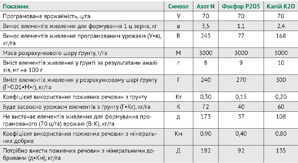 Отже, за схемою розрахунку, викладеною в табл. 1, для одержання 70 ц/га зерна необхідно внести добрива в нормі N192P92K135. Це орієнтовна норма, яка може змінюватися під впливом коливання коефіцієнтів використання поживних речовин з ґрунту і мінеральних добрив, родючості ґрунту і вмісту в ньому елементів живлення тощо.