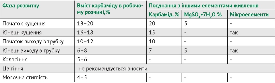 Листове внесення карбаміду можна проводити практично при всіх обприскуваннях фунгіцидами та інсектицидами. У фазі виходу в трубку часто спостерігається нестача вологи, що обмежує засвоєння елементів живлення з ґрунту. За таких умов листкове підживлення забезпечує значний ефект. У суху погоду цей агрозахід доцільний у фазі колосіння для кращого виповнення зерна і підвищення вмісту білка.