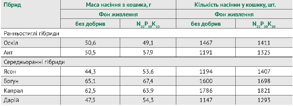 При внесенні добрив у гібридів збільшувалася кількість насінин та маса насіння з кошика, але при цьому виявлені притаманні кожному гібриду особливості. Так, наприклад, відмічали збільшення кількості насінин у кошику на фоні N30Р30К30 порівняно з фоном без добрив. Найбільшу кількість насінин у кошику відмічено на інтенсивному фоні живлення, яка становила у гібрида Богун 1698 шт., у гібрида Капрал — 1821 шт. (табл. 4).