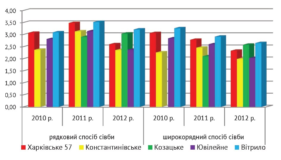 Як у посушливому 2012-му, так і вологому 2011 роках виявлена перевага за рядковим способом сівби з різницею урожайності, в середньому після попередника соя на 0,40–0,66 т/га. Якщо аналізувати рівень урожайності за сортами, то видно, що всі досліджувані сорти формували більшу врожайність за рядкового способу сівби. Серед досліджуваних сортів найбільш чутливими до способу сівби виявились сорти проса Козацьке зменшення урожайності становило від 0,46 т/га до 0,80 т/га та Вітрило — від 0,56 т/га до 0,61 т/га залежно від років (рис. 1).