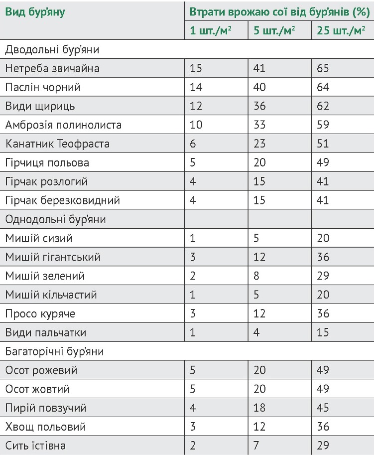 Неглибоке проникнення коренів, низька висота рослин, слабке затінення поверхні грунту і повільний ріст на початку вегетації зумовлюють високу чутливість сої до бур’янів у період від сходів до гілкування (40–50 днів). Критичним періодом для контролю бур’янів є фаза з 1 по 3 справжній листки культури (табл. 1). Саме у цей період слід приділяти особливу увагу їх контролю у посівах. Окрім того, одним із важливих елементів у системі отримання високих урожаїв насіння є забезпечення обмеження шкідливості бур’янів до змикання міжрядь культури.