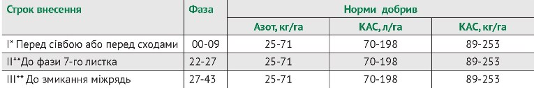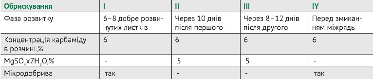 Проводять також листкове підживлення розчином карбаміду у концентрації 6–10 % (табл. 3).