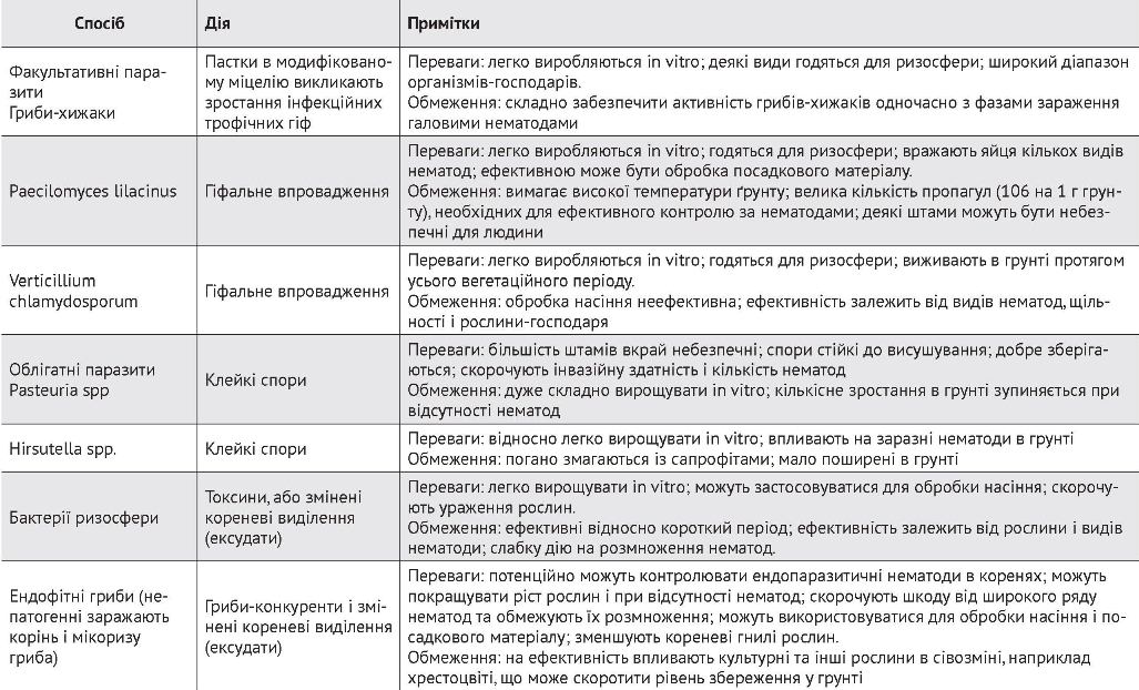 Таблиця. Переваги та обмеження способів біоконтролю різної дії проти нематод