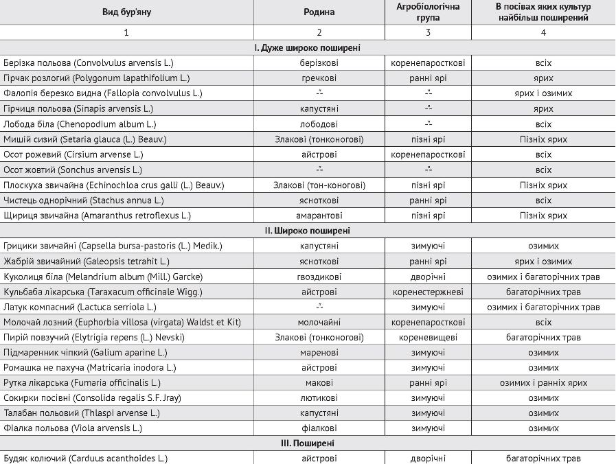 В умовах зони на полях зустрічається декілька сот видів бур’янів. Але тільки частина з них складає реальну загрозу врожаю. Залежно від частоти зустрічання в посівах і участі у формуванні біомаси агрофітоценозу всі бур’яни можна поділити на 5 груп: дуже широко поширені, широко поширені, поширені, малопоширені і випадкові.