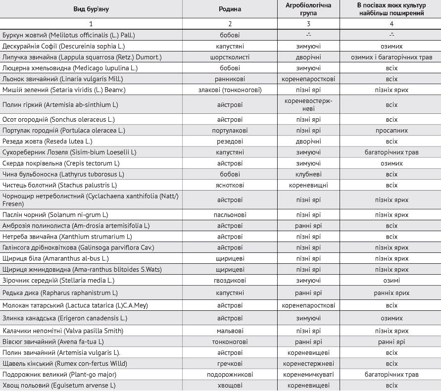 Нижче показані види бур’янистих рослин, які за поширеністю входять у перші три групи (табл. 2).