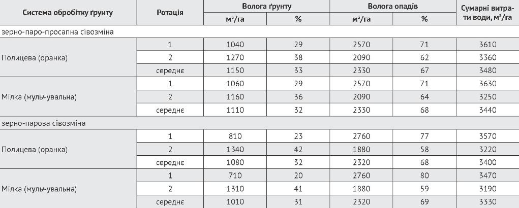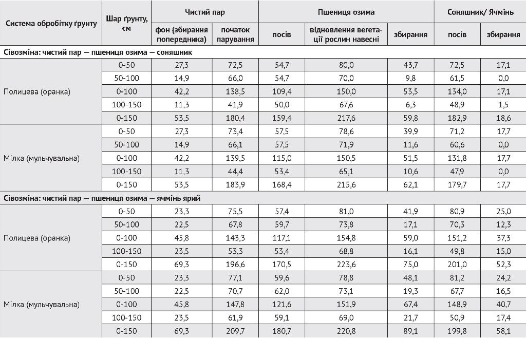 На ділянках стерньового раннього пару до часу стійкого похолодання формувався щільний захисний екран, утворений стоячою стернею, подрібненою соломою і відмерлою рослинністю. У рамках незайманого з осені фону спостерігалось істотне зниження швидкості вітру в приземному повітряному просторі, більш раннє і рівномірне відкладення снігу, підвищення його в’язкості і щільності. У поєднанні з високою буферною й утримуючою здатністю раннього пару це сприяло меншим втратам води на стік, випаровуванню, вимерзанню і видуванню, що, в свою чергу, збільшувало коефіцієнт засвоєння опадів і додаткове накопичення вологи в коренеактивному шарі ґрунту (0-150 см) порівняно з оранкою в середньому на 13,1 мм (табл. 1).