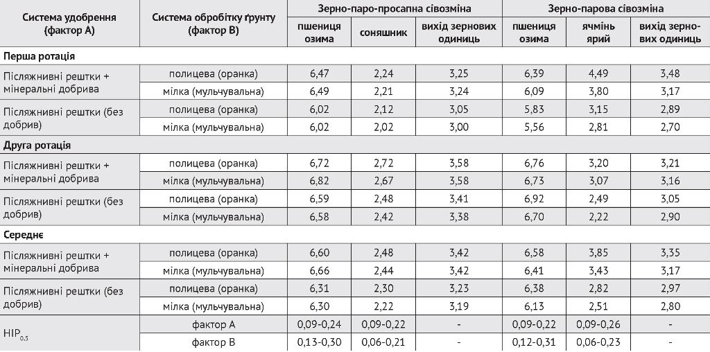 Аналіз отриманих даних показує, що зерно-паро-просапна сівозміна з полем соняшнику виявилась більш продуктивною, а ніж зерно-парова з полем ячменю ярого (відповідно 3,19-3,42 і 2,80-3,35 т зернових одиниць/ на 1 га сівозмінної площі). У першій сівозміні різні системи обробітку ґрунту (полицева (оранка), мілка (мульчувальна)) в межах окремих фонів удобрення по продуктивності ріллі були однаковими, у другій перевагу мала полицева оранка, через погіршення агротехнічних умов вирощування пшениці озимої та ячменю ярого на фоні мілкого залягання післяжнивних залишків. Внесення мінеральних добрив сприяло підвищенню продуктивності сівозмін у цілому на 5,6-11,7%.