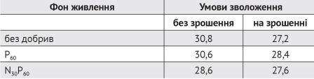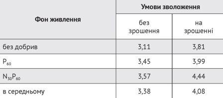 Як свідчать результати трирічних досліджень, середня урожайність гороху перебувала на рівні 3,73 т/га. Найменшу урожайність відмічали на фоні без добрив, яка становила без зрошення 3,11 т/га та на зрошенні 3,81 т/га (табл. 1). Без зрошення на фоні P60 прибавка урожаю була істотною і становила 0,34 т/га. Застосування азотно-фосфорних добрив у дозі забезпечило отримання прибавки урожаю на рівні 0,46 т/га порівняно з фоном без добрив. На зрошенні при застосуванні добрив у дозі N30P60 відмічали збільшення урожайності, яке становило 0,63 т/га та 0,45 т/га порівняно з фоном без добрив та P60. Порівнюючи урожайність гороху при вирощуванні за різних умов зволоження, встановлено, що на зрошенні на фоні без добрив збільшення урожайності становило 0,70 т/га, або 22,5% та на фоні N30P60 — 0,87 т/га, або 24,4% порівняно з урожайністю без зрошення.